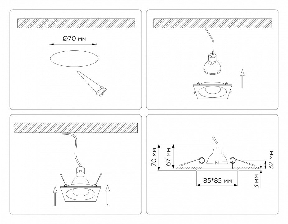 Размер врезного отверстия составляет 70 мм, а упаковка имеет размеры 95x90x40 мм, что делает установку светильника простой и удобной. Степень пылевлагозащиты IP-20 гарантирует надежную работу в помещениях с нормальными условиями эксплуатации.