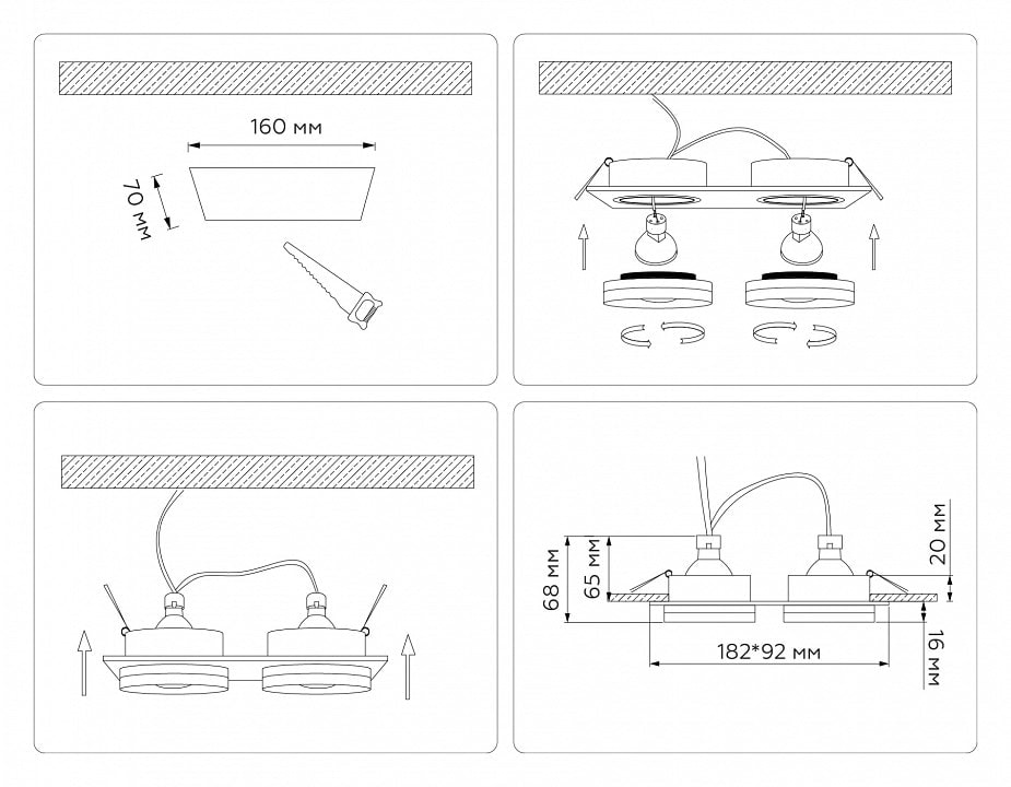 Светильник имеет степень пылевлагозащиты IP-20, что делает его подходящим для использования в помещениях с повышенной влажностью, таких как ванные комнаты. Размер врезного отверстия составляет 160x70 мм, а общая мощность устройства достигает 20 Вт.