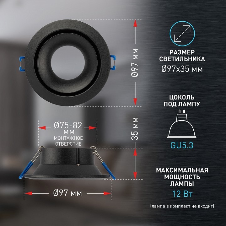 Светильник имеет компактные размеры: глубина и выступ составляют всего 35 мм, что делает его идеальным для установки в потолки с ограниченным пространством. Размер врезного отверстия составляет 75 мм, что обеспечивает простоту и удобство монтажа.