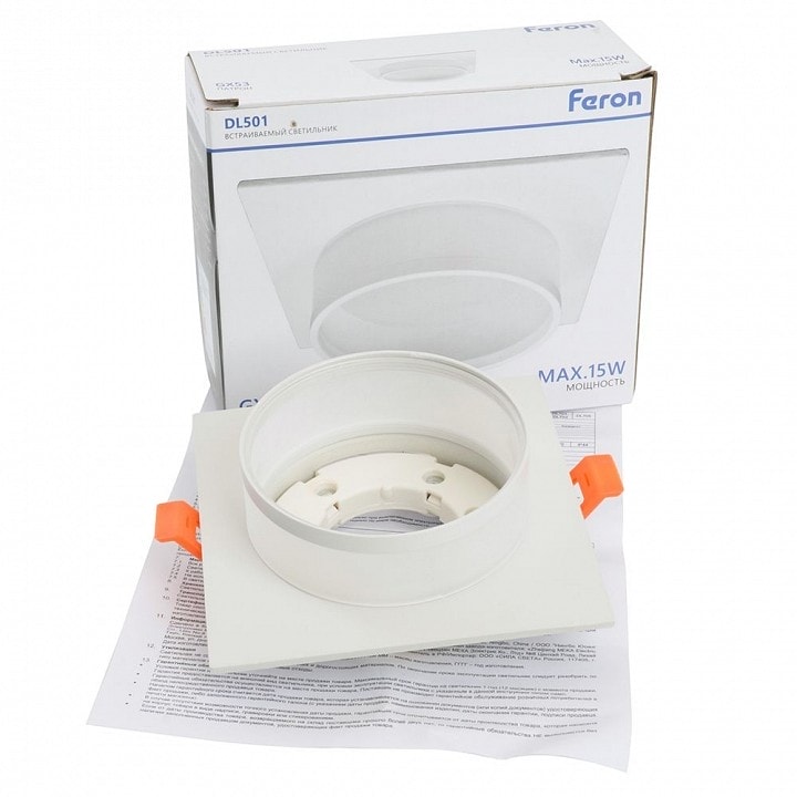 Светильник Feron DL500 имеет высоту всего 48 мм и предназначен для установки в потолок. Он оснащен одним плафоном, который направляет свет вниз, обеспечивая равномерное освещение площади до 7.5 м². Максимальная мощность лампы составляет 15 Вт, что делает его идеальным выбором для гостиных, кухонь и других помещений.