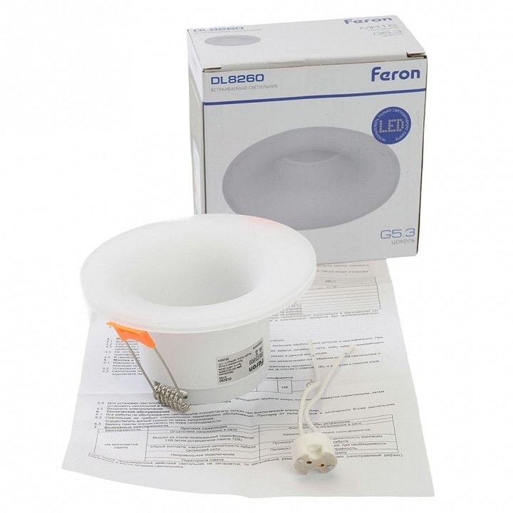 Светильник Feron DL8260 имеет компактные размеры: высота всего 55 мм, что позволяет легко интегрировать его в потолочные конструкции. Он предназначен для установки в гостиных, где требуется качественное и направленное освещение. Максимальная мощность лампы составляет 50 Вт, что обеспечивает достаточную яркость для комфортного освещения.