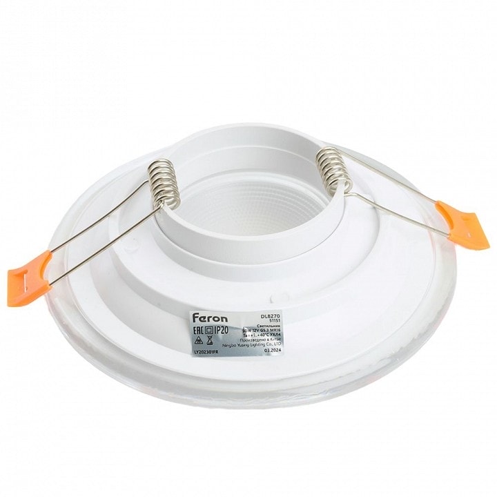 Feron DL8270 51151 предназначен для установки в потолок и отлично подходит для освещения гостиных, кухонь и других помещений. Напряжение питания составляет 230 В, что делает его универсальным для использования в большинстве домашних условий. Степень пылевлагозащиты IP20 гарантирует надежную работу в помещениях с нормальными условиями эксплуатации.