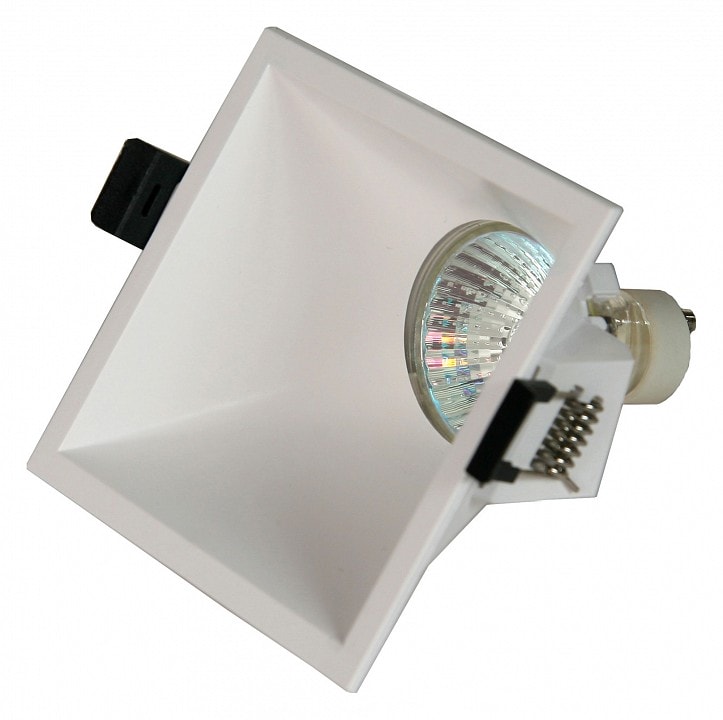 Светильник имеет компактные размеры: глубина составляет всего 69 мм, а размер врезного отверстия – 85x85 мм. Он идеально подходит для установки в потолок, что позволяет сэкономить пространство и создать эффект невидимого освещения. Максимальная мощность лампы составляет 12 Вт, а тип цоколя – GU10, что делает его совместимым с различными светодиодными лампами.