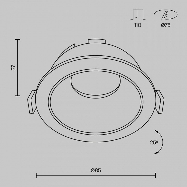 Светильник имеет степень пылевлагозащиты IP20, что делает его идеальным для использования в помещениях с низким уровнем влажности. Установка светильника не займет много времени благодаря размеру врезного отверстия в 75 мм. Его легкий вес в 0.09 кг позволяет без труда монтировать его на потолок.