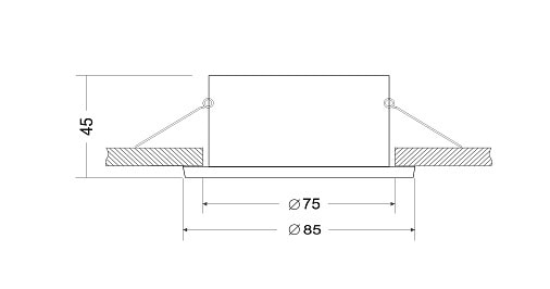Светильник имеет степень пылевлагозащиты IP65, что позволяет использовать его в помещениях с повышенной влажностью, таких как кухни или ванные комнаты. Установка не требует дополнительных компонентов, а размер врезного отверстия составляет 75 мм, что делает процесс монтажа простым и быстрым.