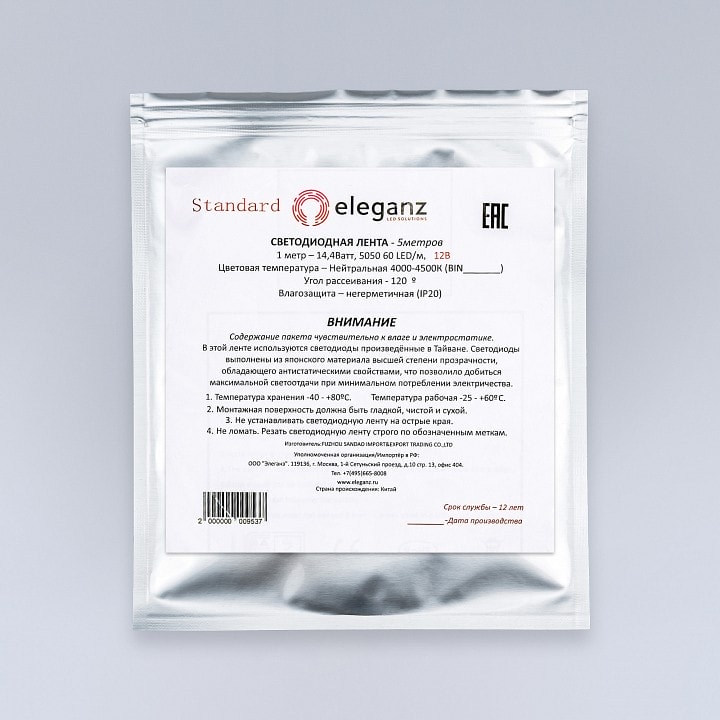 Произведенная в России, светодиодная лента Eleganz EL-SS-14N гарантирует высокое качество и надежность. Используйте её для создания акцентного освещения, подсветки мебели или оформления праздничных мероприятий. Не упустите возможность преобразить ваше пространство с помощью этой стильной и функциональной светодиодной ленты!