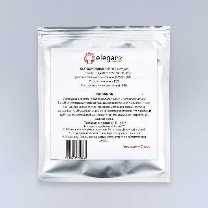Светодиодная лента Eleganz EL-SS-14WW имеет степень пылевлагозащиты IP-20, что делает её подходящей для использования в помещениях, но не на улице. Размер упаковки составляет 210x15x190 мм, что позволяет удобно хранить и транспортировать продукт.