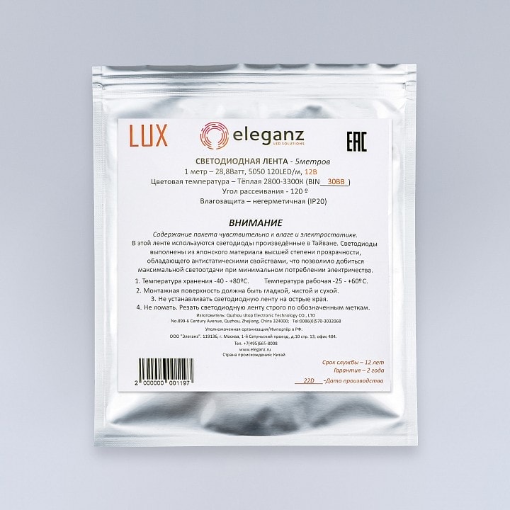 Произведенная в России, лента Eleganz LUX EL-LS-28WW гарантирует надежность и долговечность. Используйте её для подсветки мебели, создания акцентного освещения или оформления праздничных мероприятий. Преобразите ваше пространство с помощью светодиодной ленты Eleganz!