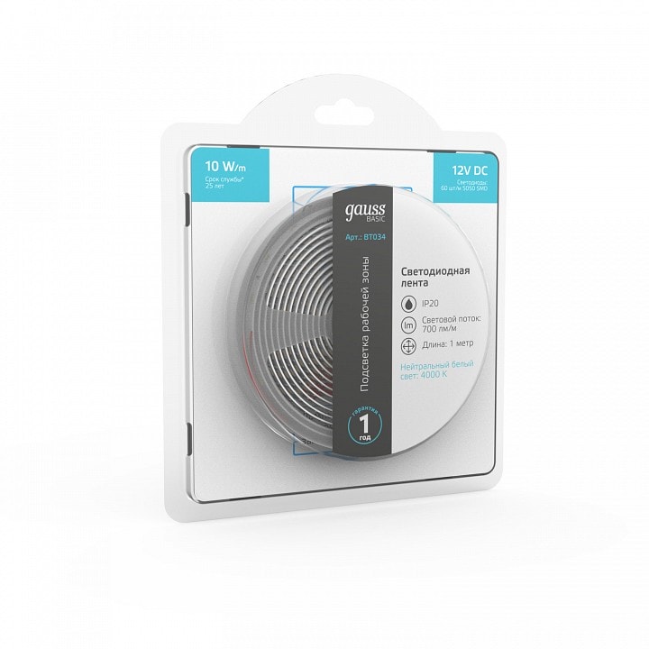 Светодиодная лента Gauss Basic BT034 работает на напряжении 12 В и имеет общую мощность 10 Вт. В комплекте вы получите 60 ярких светодиодов, которые обеспечивают отличное освещение. Для работы ленты необходим блок питания на 12 В, который не входит в комплект, но легко доступен на нашем сайте pletora.ru.
