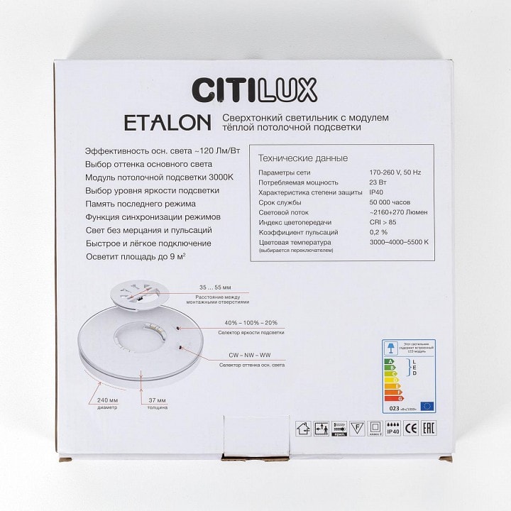 С диаметром 240 мм и высотой всего 37 мм, светильник Citilux Etalon легко впишется в любой интерьер, добавляя ему изысканности. Он оснащен одним цилиндрическим плафоном, который направляет свет вниз, создавая уютную атмосферу в помещении. Максимальная мощность лампы составляет 23 Вт, что позволяет эффективно освещать площадь до 11.5 м².