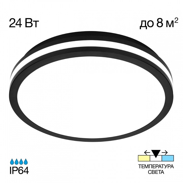 Светильник имеет диаметр 290 мм и высоту всего 54 мм, что делает его компактным и удобным для установки на потолке. Он оснащен одним плафоном, который направляет свет вниз, обеспечивая равномерное освещение площади до 12 м². Благодаря использованию светодиодной лампы мощностью до 24 Вт, вы получите яркий и экономичный свет, который прослужит долго.