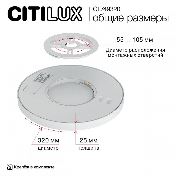 Citilux Norma CL749320 работает от сети с напряжением 220 В и имеет степень пылевлагозащиты IP 40, что делает его подходящим для использования в различных помещениях. В комплекте с светильником идет пульт ДУ, который позволяет удобно управлять освещением, включая возможность диммирования.