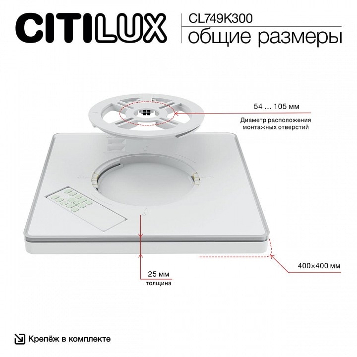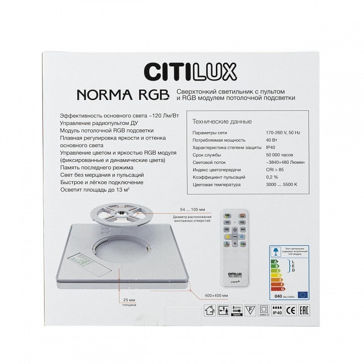 Citilux Norma CL749K300 оснащен пультом ДУ, что позволяет вам легко управлять яркостью и создавать нужное настроение в комнате. Степень пылевлагозащиты IP 40 гарантирует надежность и долговечность светильника, даже в условиях повышенной влажности.