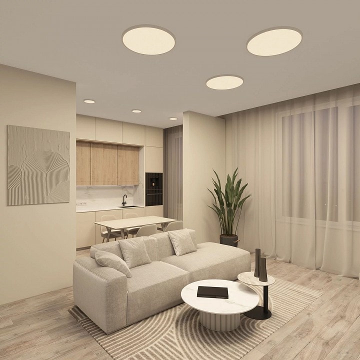 Светильник имеет диаметр 600 мм и высоту всего 25 мм, что делает его компактным и незаметным, но при этом он обеспечивает отличное освещение площадью до 25 м². Благодаря одному светодиодному плафону, который направлен вниз, вы получите яркий и равномерный свет, создающий комфортную атмосферу в вашем доме.