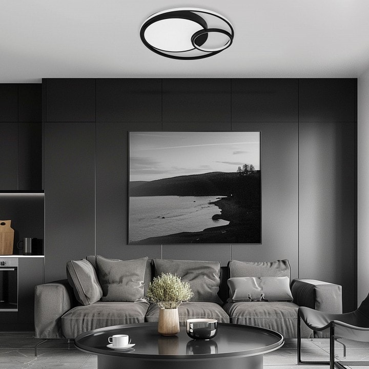 С высотой всего 80 мм и одним плафоном, этот светильник идеально подходит для потолочного размещения. Он оснащен светодиодной лампой мощностью до 129 Вт, что обеспечивает яркое и равномерное освещение площади до 64.5 м². Направление плафонов можно регулировать, что позволяет направлять свет в стороны или вниз, создавая уютную атмосферу в вашем доме.