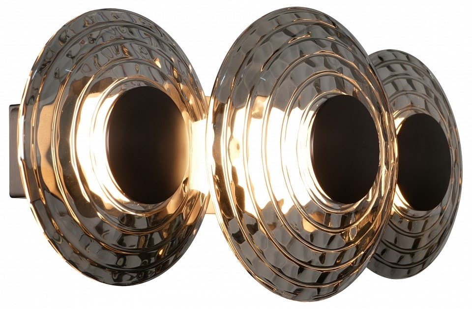 Светильник имеет три плафона, выполненных в форме кругов с выпуклой поверхностью, которые направлены в стороны, обеспечивая равномерное распределение света. Максимальная мощность лампы составляет 6 Вт на каждый плафон, что в сумме дает 18 Вт общей мощности. В комплект входят светодиодные лампы, которые не только экономят электроэнергию, но и имеют длительный срок службы.