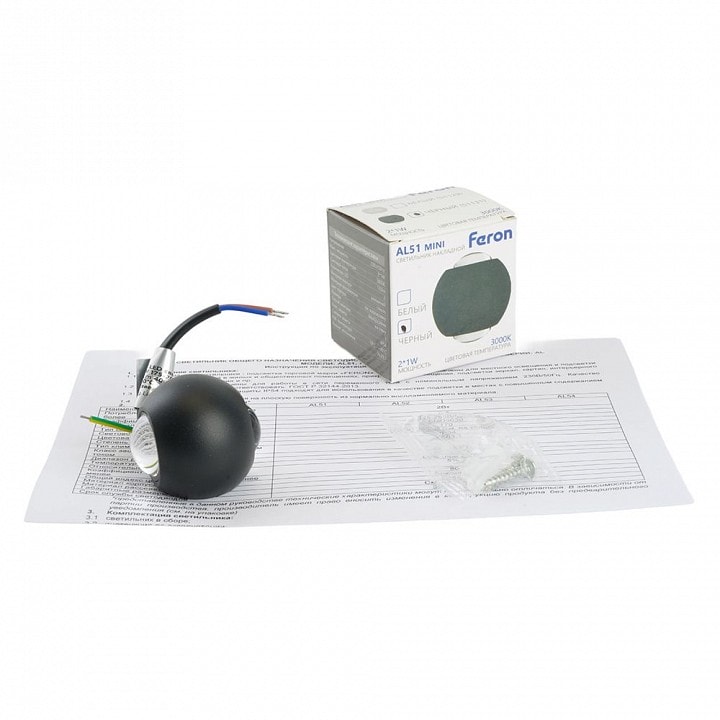 Светильник Feron AL51 имеет компактные размеры: глубина и выступ составляют всего 32 мм, что позволяет установить его даже в ограниченных пространствах. Он оснащен одним плафоном в форме сферы, который направляет свет вверх и вниз, создавая уютную атмосферу и равномерное освещение.