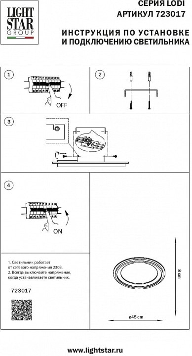 Светильник Lightstar Lodi 723017 имеет степень пылевлагозащиты IP20, что позволяет использовать его в помещениях с нормальными условиями. Его масса составляет всего 2.35 кг, что упрощает установку на потолке. Упаковка светильника имеет размеры 510x520x140 мм, что делает его удобным для транспортировки.