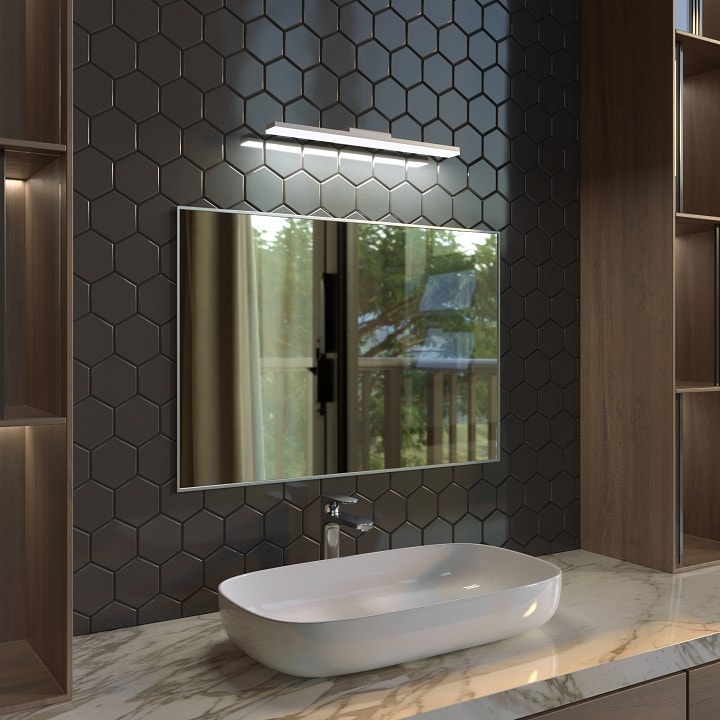 С глубиной всего 95 мм и выступом 95 мм, данная подсветка идеально впишется в любой интерьер, добавляя нотку техно-стиля. Она оснащена одним светодиодным плафоном, который обеспечивает максимальную мощность в 12 Вт и освещает площадь до 6 м². Направление света можно регулировать вниз и вперед, что позволяет создать необходимую атмосферу в ванной комнате.