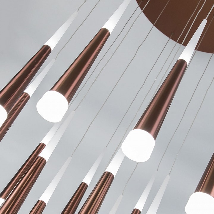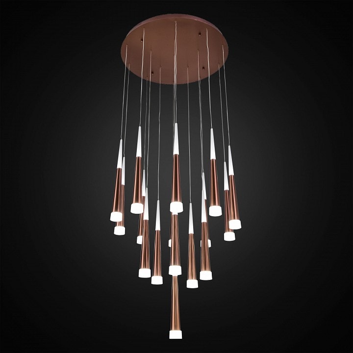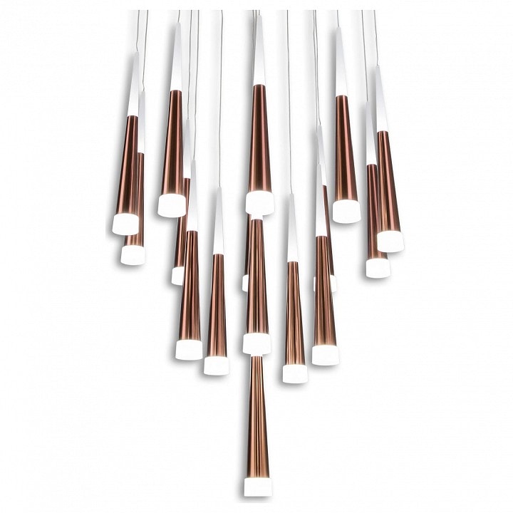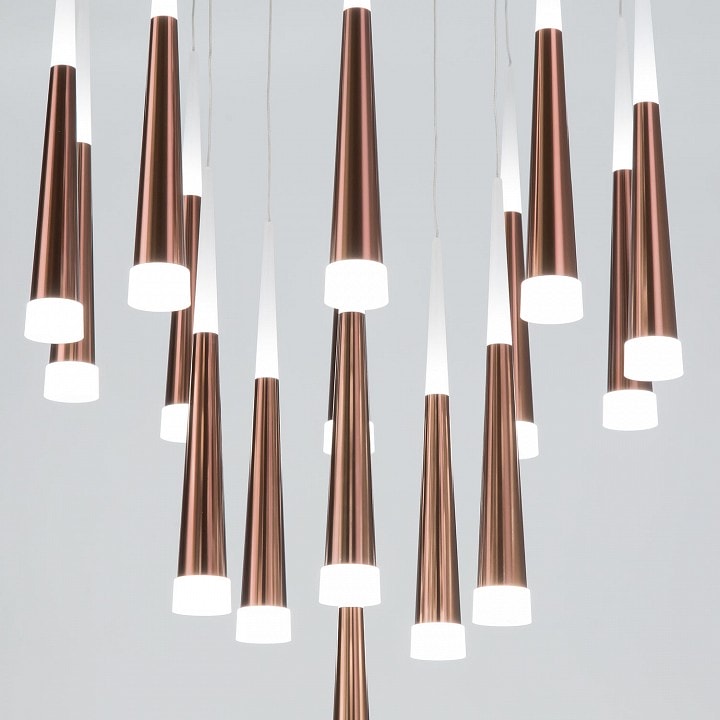 Светильник выполнен в современном стиле, что делает его универсальным решением для различных интерьеров. Конусные круглые плафоны направлены вниз, создавая мягкое и приятное освещение. Степень пылевлагозащиты IP20 гарантирует надежность и долговечность в эксплуатации.