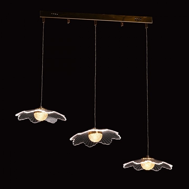 Светильник работает на светодиодных лампах (LED) с максимальной мощностью 20 Вт каждая, что обеспечивает общую мощность в 60 Вт. Это позволяет освещать площадь до 30 м², что делает его идеальным выбором для гостиных и других просторных помещений. Направление плафонов направлено вниз, что создает мягкое и равномерное освещение.