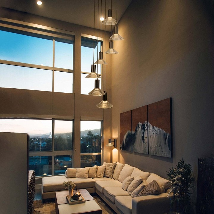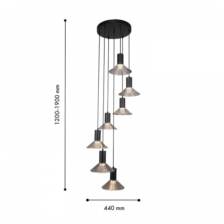 С диаметром 440 мм и высотой 1200 мм, светильник идеально подходит для потолочного размещения, обеспечивая равномерное освещение площади до 21 м². С семью плафонами, направленными вниз, он создает мягкий и комфортный свет, который идеально подходит для вечерних встреч с друзьями или семейных ужинов.