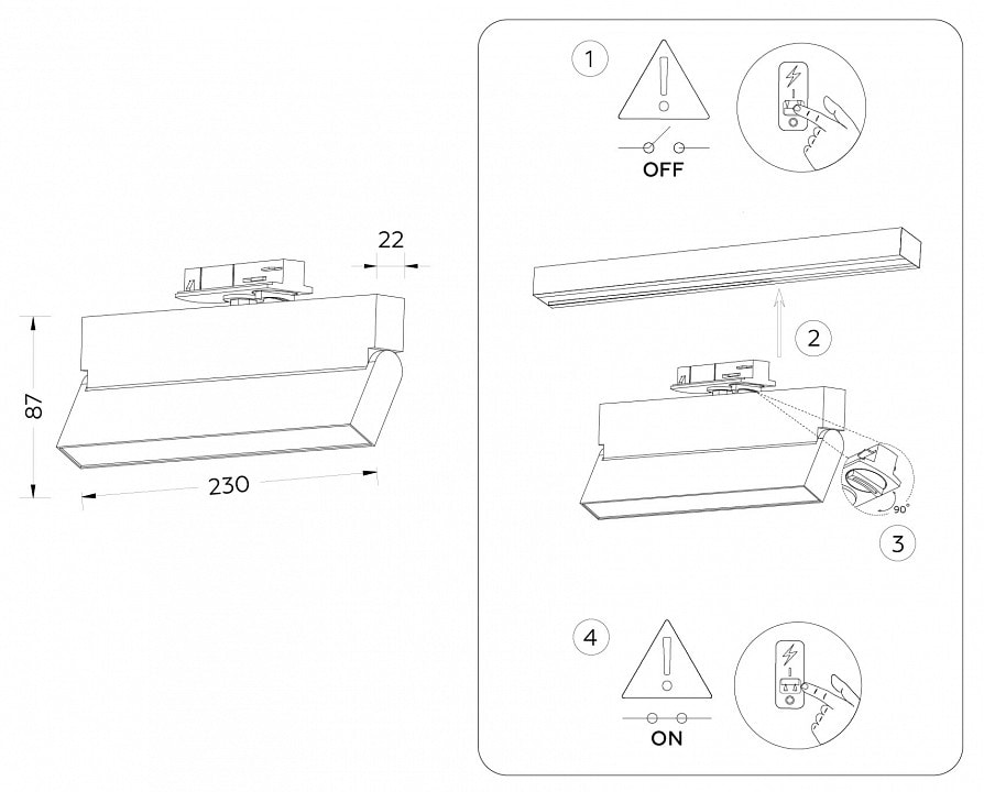 Светильник предназначен для потолочного монтажа и требует однофазный трек для установки. Напряжение питания составляет 165-265 В, что делает его совместимым с большинством электрических систем. Степень пылевлагозащиты IP-20 гарантирует надежную работу в офисных условиях.