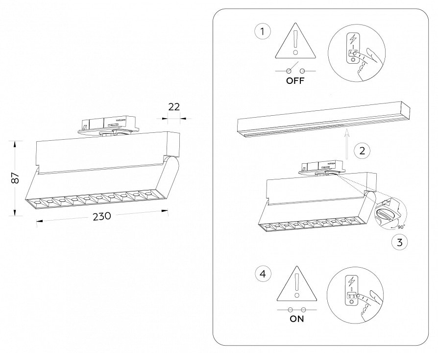 Светильник работает в диапазоне напряжения 165-265 В и требует однофазный трек для установки. Его стильный техно-дизайн и прямоугольная форма плафонов придают помещению современный вид, а степень пылевлагозащиты IP-20 гарантирует надежность в эксплуатации.