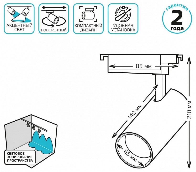 Светильник имеет степень пылевлагозащиты IP20, что позволяет использовать его в помещениях с низким уровнем влажности. Благодаря цилиндрической форме плафона и возможности направлять свет в любое направление, вы сможете легко настроить освещение под свои нужды.