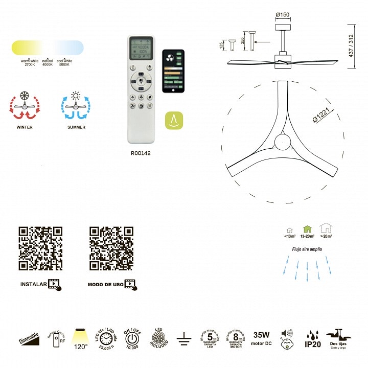С диаметром 1221 мм и высотой 312 мм, Mantra Thai 8716 идеально подходит для помещений площадью до 15 м². Он оснащен одним светодиодным плафоном, который обеспечивает максимальную мощность в 30 Вт, создавая яркое и комфортное освещение. Благодаря пульту ДУ, вы сможете легко управлять светом и вентиляцией, создавая уютную атмосферу в вашем доме.