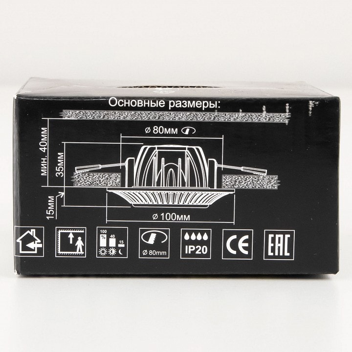 Установка светильника не вызовет трудностей: размер врезного отверстия составляет всего 80 мм, а выступ — 15 мм. Упаковка имеет размеры 105x105x60 мм, что делает его удобным для транспортировки и хранения.