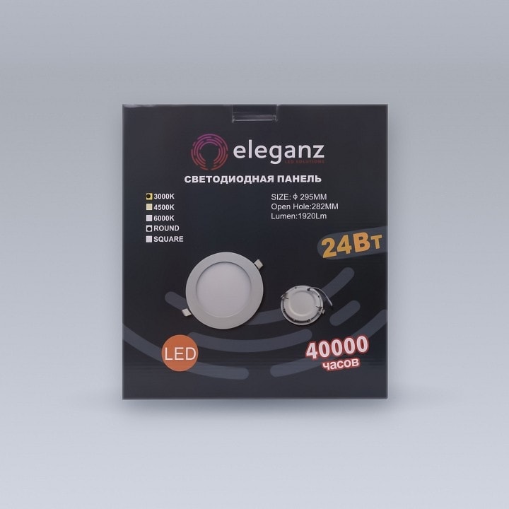 Размер врезного отверстия составляет 285 мм, что позволяет легко установить светильник в потолок. Упаковка имеет размеры 300x345x35 мм, что делает его удобным для транспортировки и хранения. Кроме того, светильник обладает степенью пылевлагозащиты IP-40, что гарантирует его надежность и долговечность в эксплуатации.