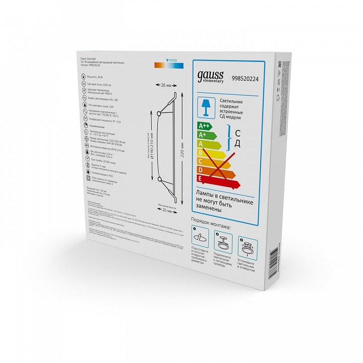 Размер упаковки составляет 247x40x232 мм, что делает его удобным для транспортировки и хранения. Не упустите возможность преобразить ваше пространство с помощью встраиваемого светильника Gauss Elementary 998520224!