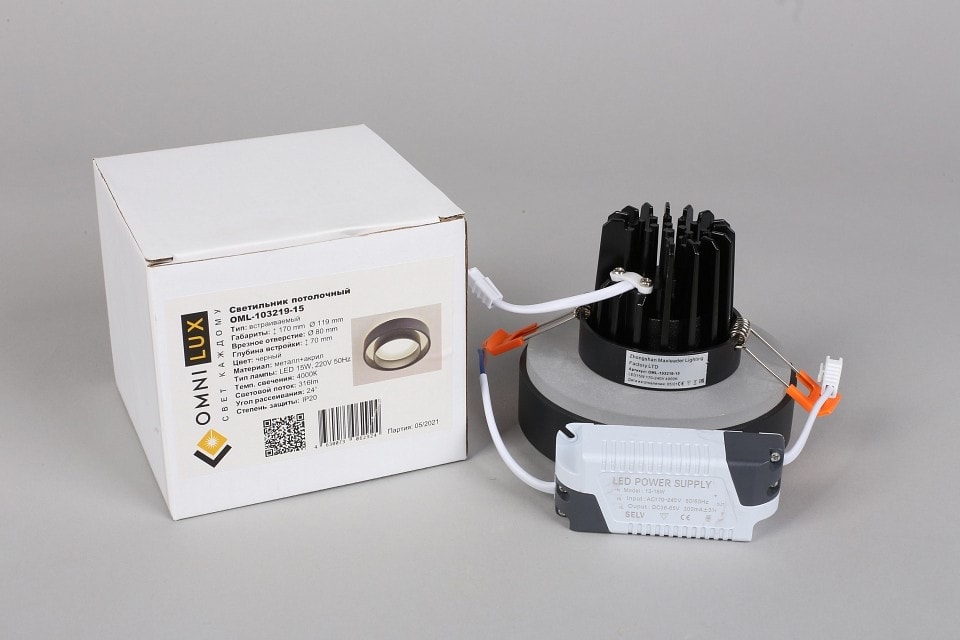Размер врезного отверстия составляет 70 мм, а упаковка имеет размеры 130x125x110 мм, что делает установку светильника простой и удобной. Масса устройства составляет всего 0.5 кг, что также облегчает процесс монтажа.