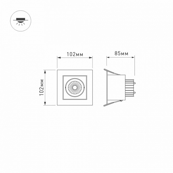 Светильник имеет одно место для установки лампы, что делает его простым в использовании и установке. Размер врезного отверстия составляет 85x85 мм, что позволяет легко интегрировать его в любой потолок. Степень пылевлагозащиты IP20 гарантирует надежную работу в помещениях с низким уровнем влажности.