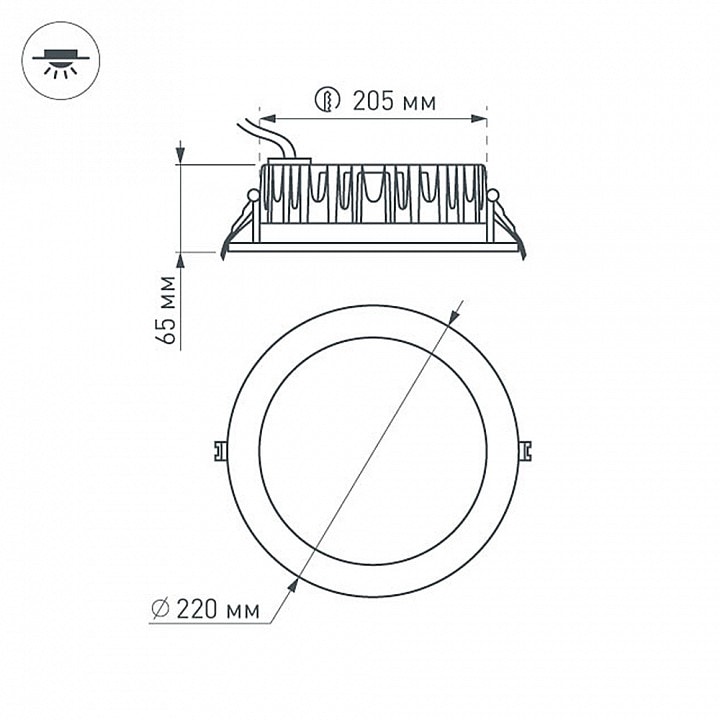 С диаметром 220 мм и размером врезного отверстия 205 мм, светильник легко устанавливается в потолок, обеспечивая равномерное распределение света. Максимальная мощность лампы составляет 30 Вт, что позволяет освещать площадь до 15 м², идеально подходя для офисных помещений.