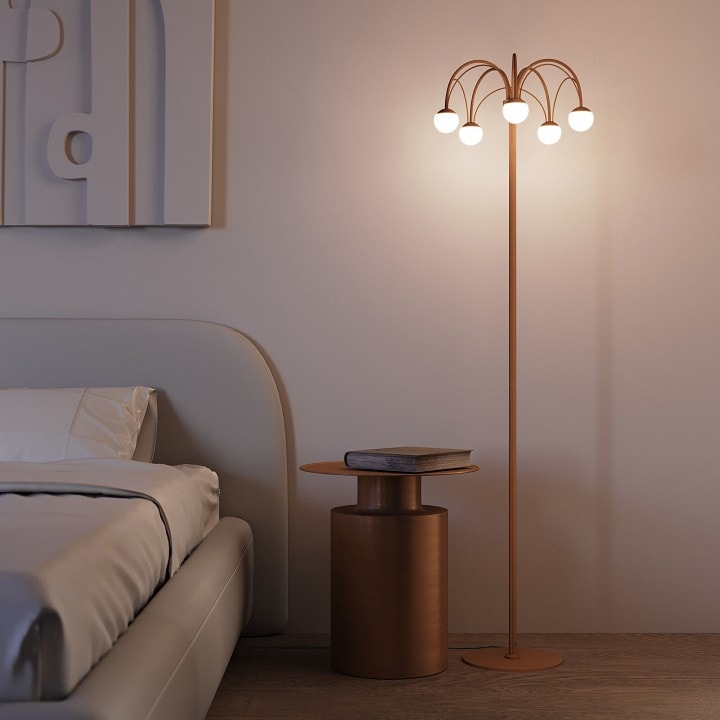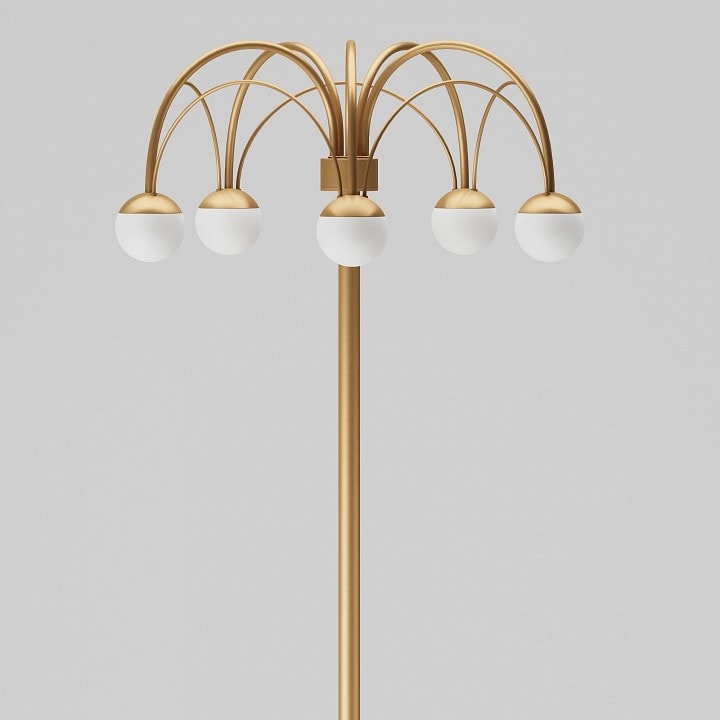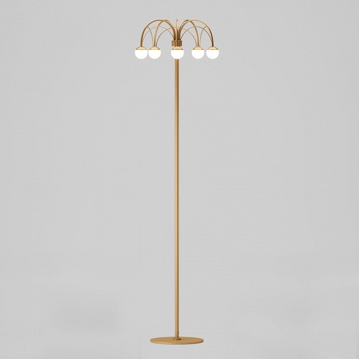 Торшер выполнен в стиле модерн и идеально впишется в любой современный интерьер. С высотой 1558 мм и диаметром 420 мм, он отлично подходит для освещения больших пространств, обеспечивая площадь освещения до 37.5 м². Благодаря пяти светодиодным плафонам, направленным вниз, вы получите мягкий и равномерный свет, создающий уютную атмосферу.
