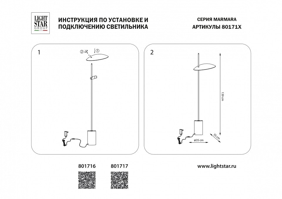 С диаметром плафона в 350 мм и высотой 1390 мм, торшер Marmara станет ярким акцентом в вашем пространстве. Он оснащен одним светодиодным плафоном, который обеспечивает максимальную мощность в 5 Вт и освещает площадь до 2.5 м². Благодаря направлению света вниз, вы получите мягкое и равномерное освещение, создающее уютную атмосферу.