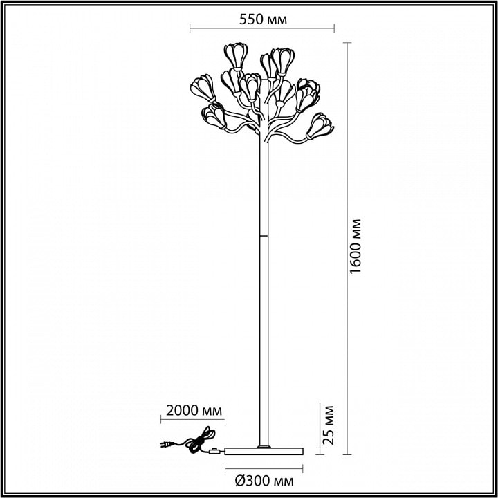 С глубиной 550 мм и высотой 1600 мм, торшер прекрасно впишется в любое пространство, обеспечивая освещение площадью до 30 м². Его 12 светодиодных ламп мощностью 5 Вт каждая создают мягкий и приятный свет, который можно регулировать с помощью ножного выключателя. Направление плафонов вверх подчеркивает флористический стиль, а форма плафонов в виде цветка-бутона добавляет изюминку в интерьер.
