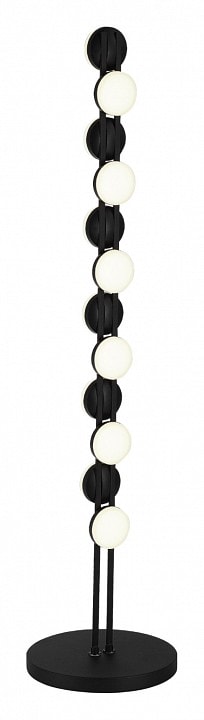 Торшер выполнен в современном стиле, что делает его универсальным элементом декора, который легко впишется в любой интерьер. Плафоны имеют круглую плоскую форму и направлены в стороны, что позволяет равномерно распределять свет по комнате. Выключатель ножного типа обеспечивает удобство в использовании, позволяя легко включать и выключать свет.