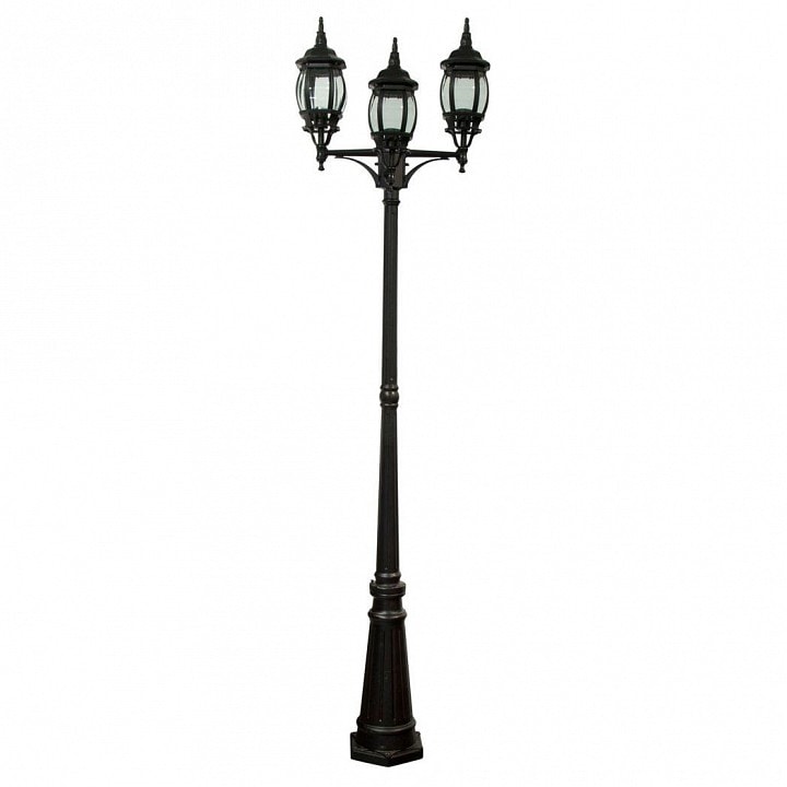 Фонарный столб имеет глубину и выступ 580 мм, что делает его заметным и привлекательным. Он оснащен тремя плафонами, которые направлены в стороны, обеспечивая равномерное распределение света. Максимальная мощность лампы составляет 100 Вт, а общее количество ламп — 3, что позволяет достичь общей мощности в 300 Вт. Обратите внимание, что лампы в комплекте отсутствуют, поэтому вы можете выбрать подходящие лампы с цоколем E27 по вашему вкусу.